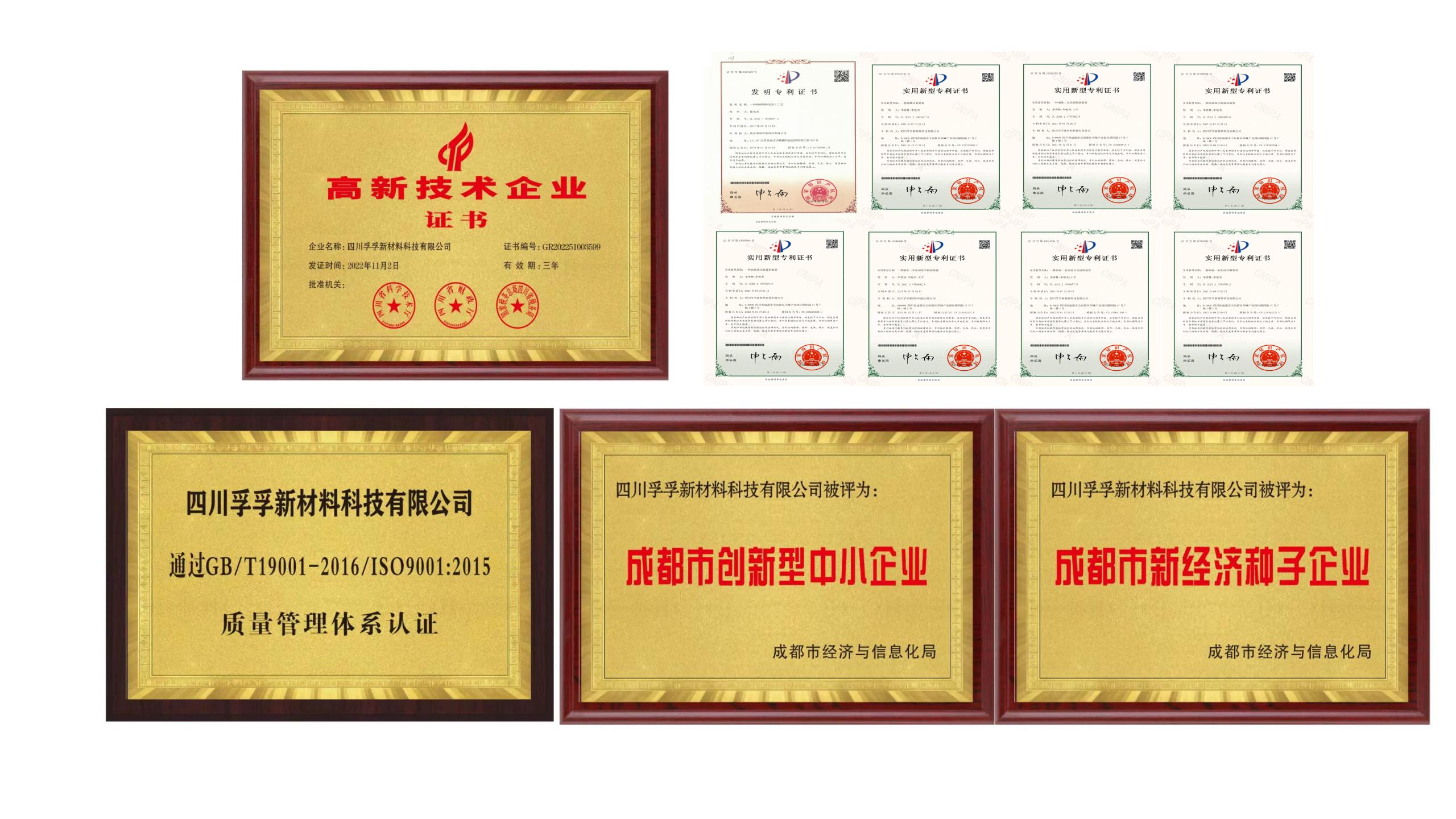 孚孚新材料当前已获得成都市”新经济种子企业“、”创新型中小企业“、国家”高新技术企业“等多项荣誉称号。